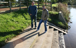 INGRESS and EGRESS STEPSAt their site at Kirkstall, 3 miles to the West of Leeds City Centre LEEDS Canoe Club has a fine set of access steps to enable paddlers to launch on to the River Aire.The Rails are to enable “Seal launching to take place” without damage to boat or bank. The paddler puts his Spray Deck on whilst in his craft and parked on the flat rails. Then when ready the paddler pushes himself down the sloping rails into the water. The rails are made of wood.The steps below the surface are essential for safety reasons. If a paddler whilst launching his craft in advertently puts a foot in the water he would fall in and go for a swim if the underwater steps were not there. A disadvantage of any steps is the accumulation of silt. From time to time this can be easily cleared off with a shovel or a power washer.Please note the gentle ramp down from the top of the bank to the long top step. Ideal for wheel chair access were it not for the burnt rubbish.